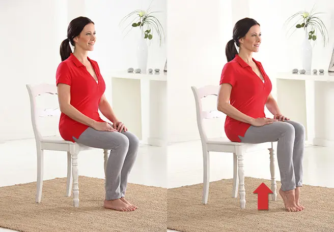 Asseyez-vous sur une chaise et posez les deux pieds sur le sol. Soulevez les talons en laissant la pointe des pieds sur le sol. Reposez les talons. Répétez l’exercice dix fois.