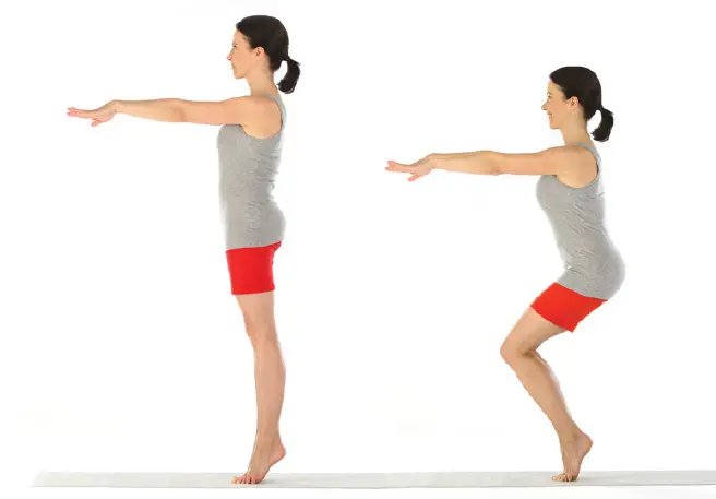 Mettez-vous debout sur la pointe des pieds, les bras parallèles au sol, les deux paumes des mains vers le bas. L’ensemble de la musculature est tendue. Maintenez la tension du corps pendant environ dix secondes et accroupissez-vous lentement en restant dans cette position. Restez quelques secondes en position accroupie et revenez dans la position initiale de manière contrôlée.