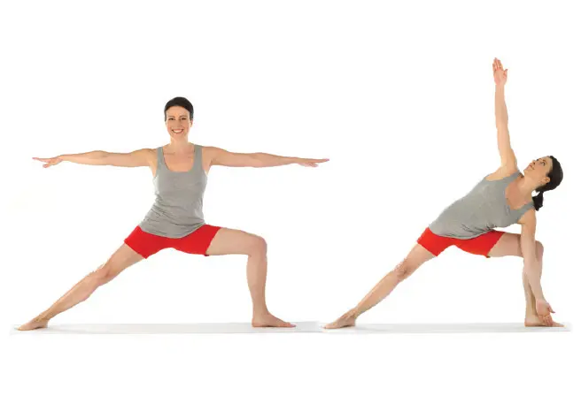 Mettez-vous debout et faites un grand pas chassé vers la gauche. Les bras sont tendus des deux côtés, les paumes des mains vers le sol. Pliez la jambe gauche à 90 degrés, la jambe droite reste tendue, le torse est redressé. En partant de cette position, touchez vos orteils avec le bras qui se trouve du côté de la jambe pliée. Le coude appuie sur le genou de l’intérieur. Restez dans cette position pendant quelques secondes, revenez dans la position initiale de manière contrôlée et changez de côté.