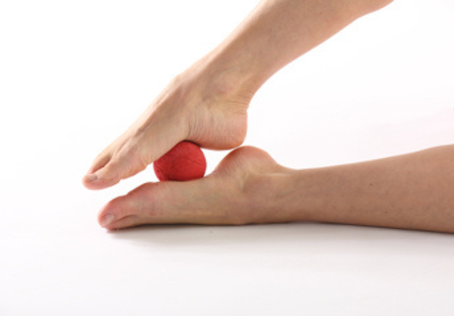 Asseyez-vous sur le sol et prenez une balle entre les pieds. Faites-la rouler vigoureusement en avant et en arrière sans la faire tomber. Pratiquez cet exercice pendant environ une minute.