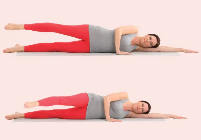 Allongez-vous sur le côté gauche, la tête posée sur le bras gauche qui est allongé, la main droite qui appuie doucement sur le sol à hauteur de la poitrine. Inspirez profondément avec le ventre et soulevez la jambe du haut tendue. En expirant, tendez la jambe en avant. Les hanches et les épaules doivent rester sur une même ligne, les abdominaux contractés. Lors de l’inspiration suivante, ramenez la jambe en position initiale. Effectuez cet exercice cinq à dix fois, puis changez de côté.