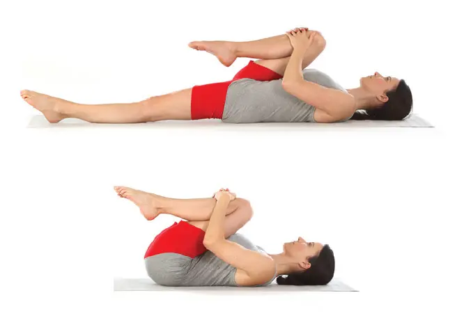 Allongez-vous de tout votre long sur le sol. Entourez votre genou droit avec les deux mains et tirez-le vers votre épaule droite. Les bras restent près du corps, la jambe gauche ne décolle pas du sol. Tenez quelques secondes dans cette position. Avant de changer de côté, repliez les deux jambes et serrez les genoux, le menton dirigé vers la poitrine. Essayez à présent de dérouler votre dos sur le sol vertèbre par vertèbre.