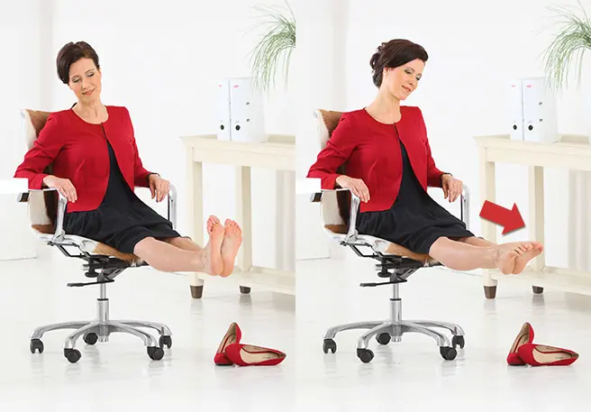Asseyez-vous sur une chaise. Soulevez les jambes tendues. Étirez vos orteils et serrez-les à nouveau. Répétez l’exercice vingt fois.