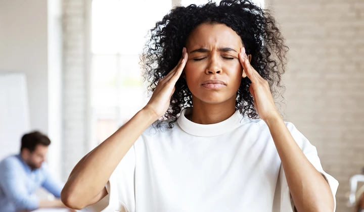Ihre Angaben deuten nicht auf Migräne, sondern auf klassische Kopfschmerzen hin. Die häufigste Form von Kopfschmerzen sind Spannungskopfschmerzen. Diese treten meistens beidseitig auf und äußern sich in einem drückenden oder beengenden Schmerz. Körperliche Aktivität kann die Spannungskopfschmerzen lindern.