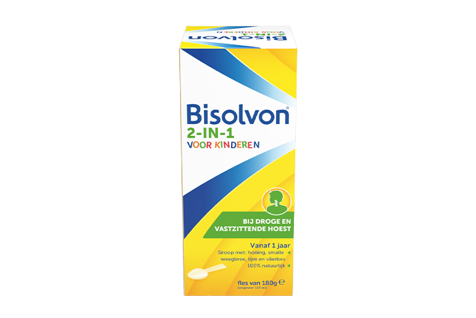 Bisolvon 2-in-1 drank voor kinderen bij droge en vastzitten hoest kan gebruikt worden bij kinderen vanaf 1 jaar. Deze drank bevat honing, tijm en smalle weegbree. Ook is er vlierbes aan toegevoegd, wat zorgt voor een lekkere smaak. De natuurlijke ingrediënten hydrateren vastzittend slijm en verminderen irriterende hoestprikkels.