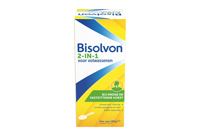Soms weet je niet precies welke hoest je hebt, bijvoorbeeld bij beginnende hoestklachten. Gebruik dan Bisolvon 2-in-1, met honing, tijm en weegbree. De natuurlijke ingrediënten hydrateren vastzittend slijm en verminderen irriterende hoestprikkels. Bovendien heeft deze drank een lekkere smaak.