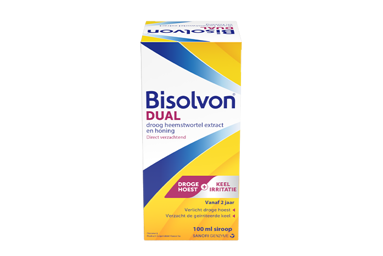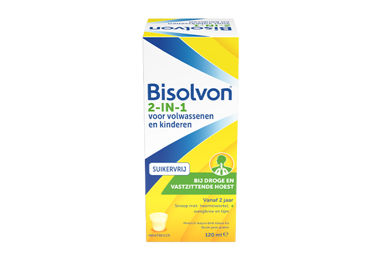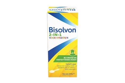 Bisolvon 2-in-1 drank voor kinderen bij droge en vastzitten hoest kan gebruikt worden bij kinderen vanaf 1 jaar. Deze drank bevat honing, tijm en smalle weegbree. Ook is er vlierbes aan toegevoegd, wat zorgt voor een lekkere smaak. De natuurlijke ingrediënten hydrateren vastzittend slijm en verminderen irriterende hoestprikkels