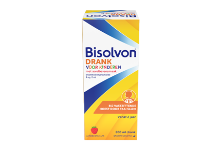 Bisolvon drank voor kinderen heeft een lekkere aardbeiensmaak en helpt bij een vastzittende hoest.