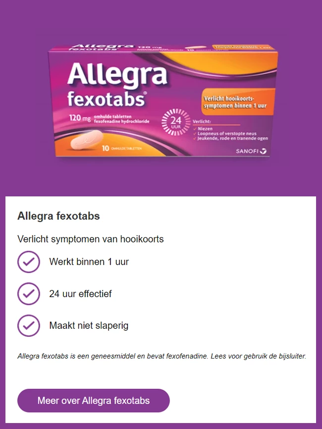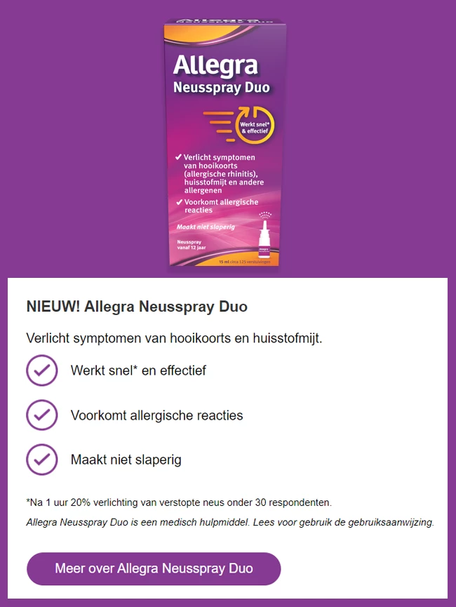 Er zijn veel verschillende hooikoorts symptomen, en soms heb je last van meerdere symptomen tegelijk. Daarom zijn er Allegra fexotabs® en Allegra Neusspray Duo.