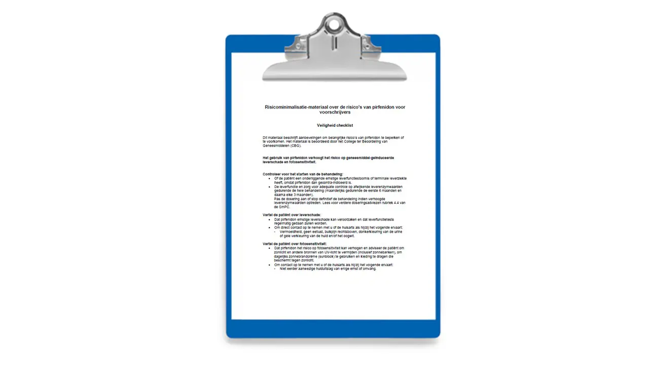 Dit materiaal beschrijft aanbevelingen om belangrijke risico’s van Pirfenidon te beperken of te voorkomen.