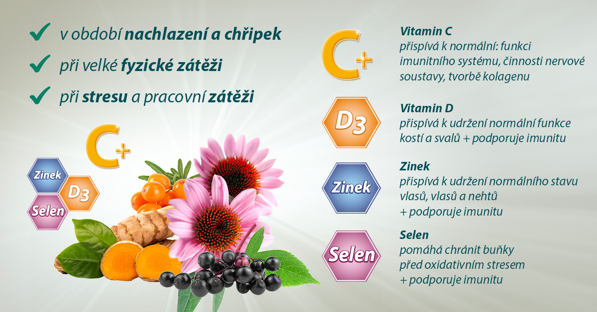✓ IMUNITA – vitamin C, vitamin D3, zinek, selen, černý bez a echinacea