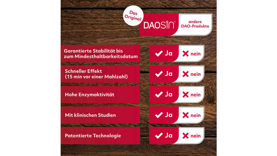 - DAOSiN® ergänzt das körpereigene DAO-Enzym zum Histaminabbau aus der Nahrung