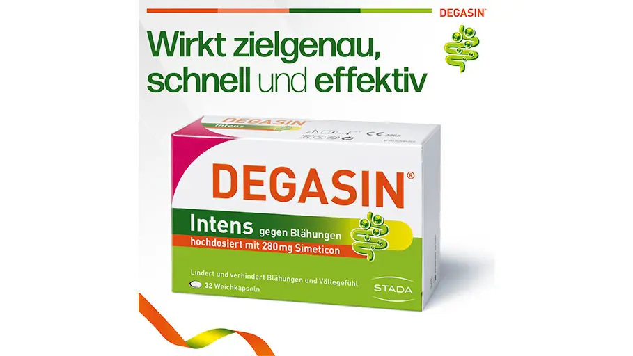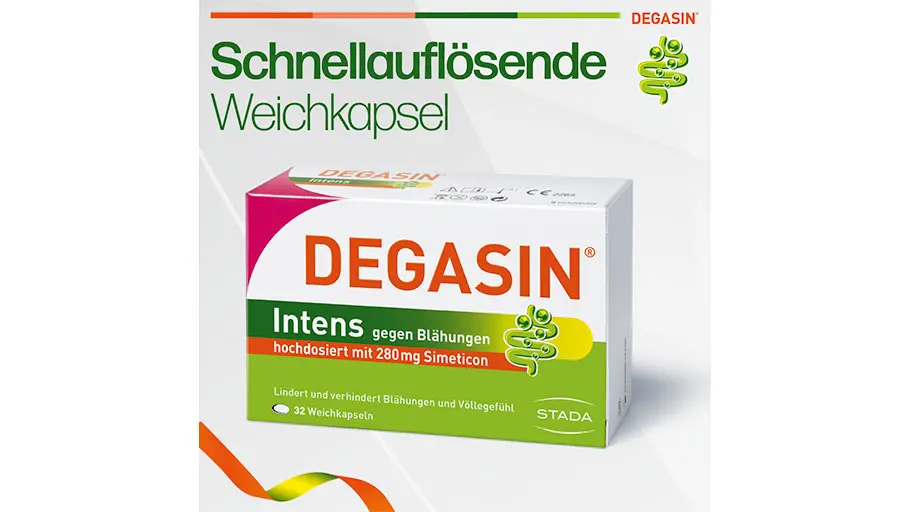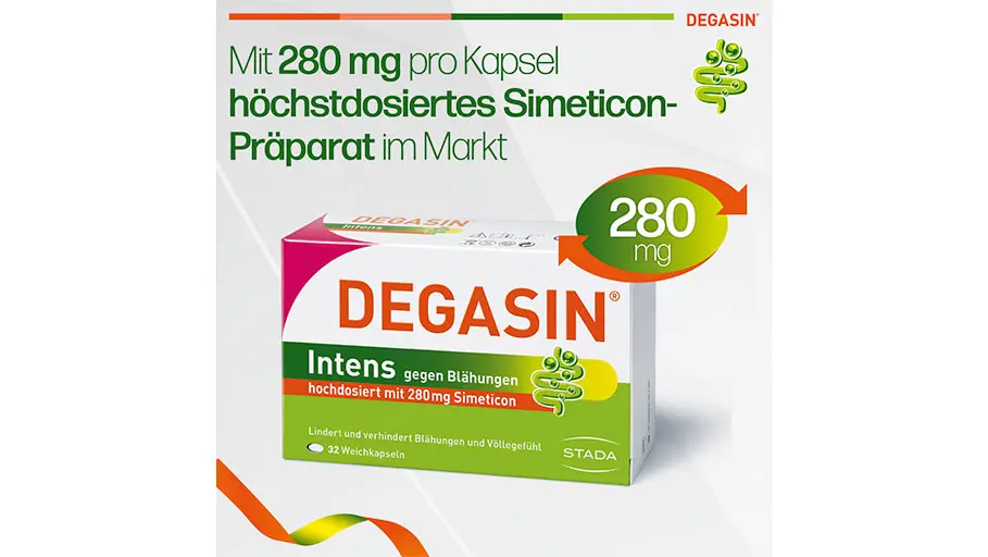 - DEGASIN® Intens mit 280 mg Simeticon: Hochdosierte Simeticon Weichkapseln bei Blähungen und gasbedingten Beschwerden