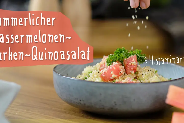 Dieser Salat mit Wassermelone schmeckt raffiniert, lĂ€sst sich aber ganz schnell und simpel zubereiten. AuĂerdem ist das Rezept fĂŒr den Quinoa Salat histaminarm. Ăberzeugen Sie sich in unserem Video, wie unkompliziert der fruchtige Sommersalat ist.