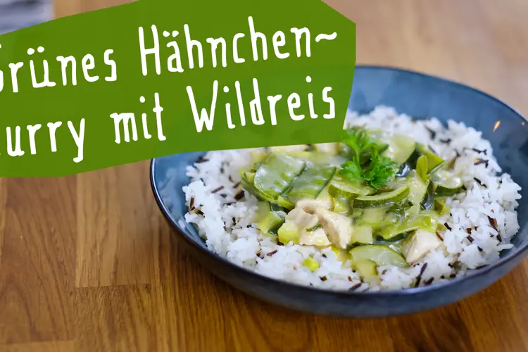 Dann geben Sie den Pak Choi dazu, braten ihn und kurz an und löschen das Hähnchencurry mit Kokosmilch und Gemüsebrühe ab. Das Curry circa 15 Minuten köcheln lassen, in der Zwischenzeit den Reis kochen.