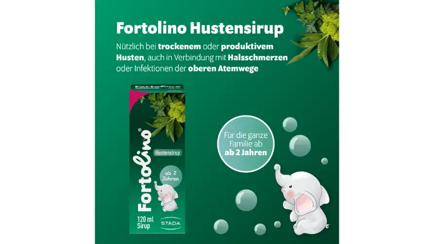 Kleinkinder können bis zu zehnmal im Jahr eine Erkältung haben.1 Daher sind wohltuende Hustenmittel auch für die Kleinsten wichtig. Fortolino® Hustensirup darf bereits ab 2 Jahren angewendet werden. Die natürlichen Inhaltsstoffe Efeu-, Spitzwegerich- und Islandmoosextrakt lindern Erkältungsbeschwerden. Der Hustensirup ist nützlich bei trockenem und produktivem Husten – auch in Verbindung mit Halsschmerzen oder Atemwegserkrankungen. Er beruhigt und schützt die gereizten Schleimhäute. Wir empfehlen eine kombinierte Anwendung mit der Fortolino® Creme.