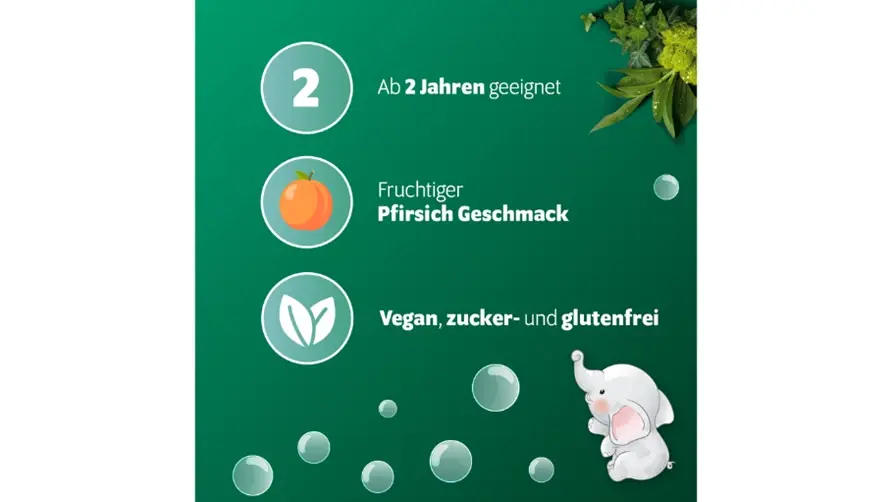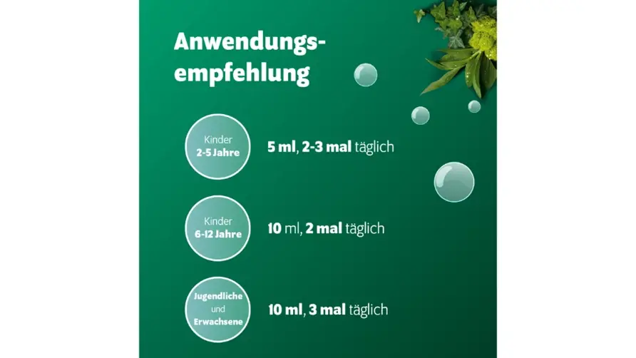 - Hustensirup bei trockenem und produktivem Husten anwendbar – auch in Verbindung mit Halsschmerzen