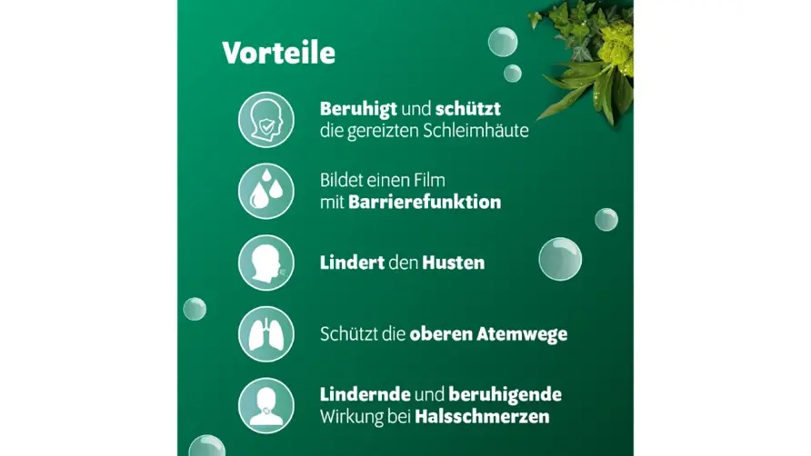 - Beruhigender Schutzfilm auf der gereizten Schleimhaut in den oberen Atemwegen