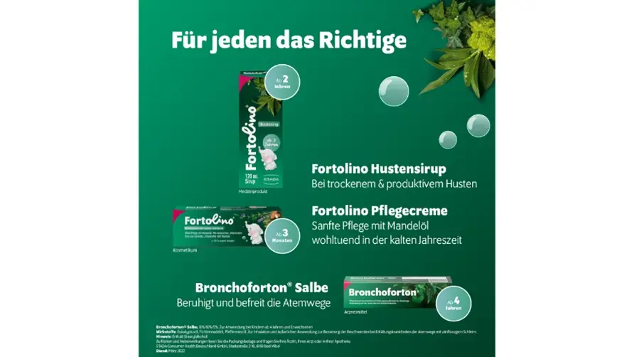 Fortolino® Hustensirup ist genauso für ältere Kinder und Erwachsene geeignet. Ab 4 Jahren kann in Kombination die Bronchoforton® Salbe angewendet werden. Bitte beachten Sie: Fortolino® Hustensirup darf im Rahmen der Selbstmedikation nicht länger als 15 Tage angewendet werden. Wenn die Symptome nach einigen (2–3) Tagen der Anwendung fortbestehen, sollten Sie einen (Kinder-) Arzt konsultieren.