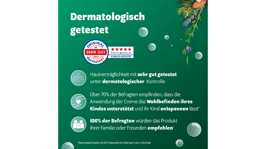 1 Fortolino® Creme wurde vom unabhängigen Institut Dermatest® unter dermatologischer & pädiatrischer Kontrolle getestet und bewertet. Dabei wurde die Creme 4 Wochen bei Kindern im Alter 0–3 Jahre angewendet. Dieser Test geht über die gesetzlich angeforderte Dauer hinaus und ermöglicht eine noch genauere Aussage zur Verträglichkeit & Sicherheit auf zarter Baby- & Kinderhaut.