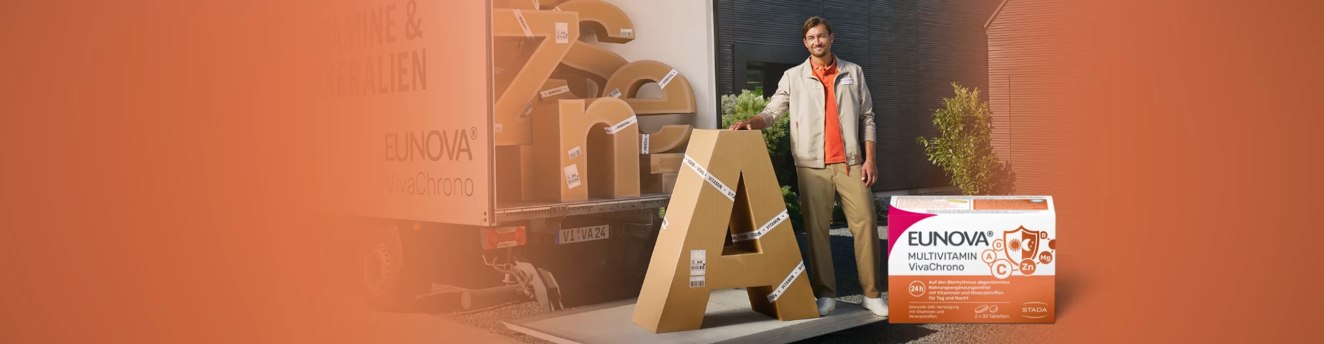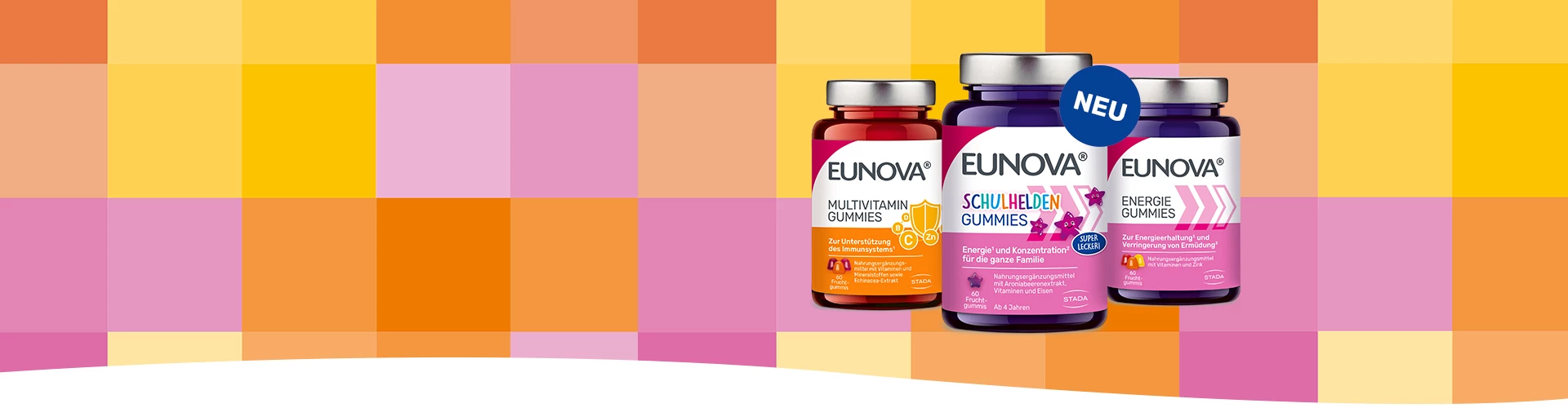 Um die großen und kleinen Herausforderungen des Lebens zu meistern, braucht unser Körper Vitamine und Mineralien. Ein ausgewogener Mix an wichtigen Mikronährstoffen trägt dazu bei, dass wir uns rundum wohl und fit fühlen. EUNOVA® von STADA macht es uns einfach, mit Vitaminen und Mineralien versorgt zu sein.