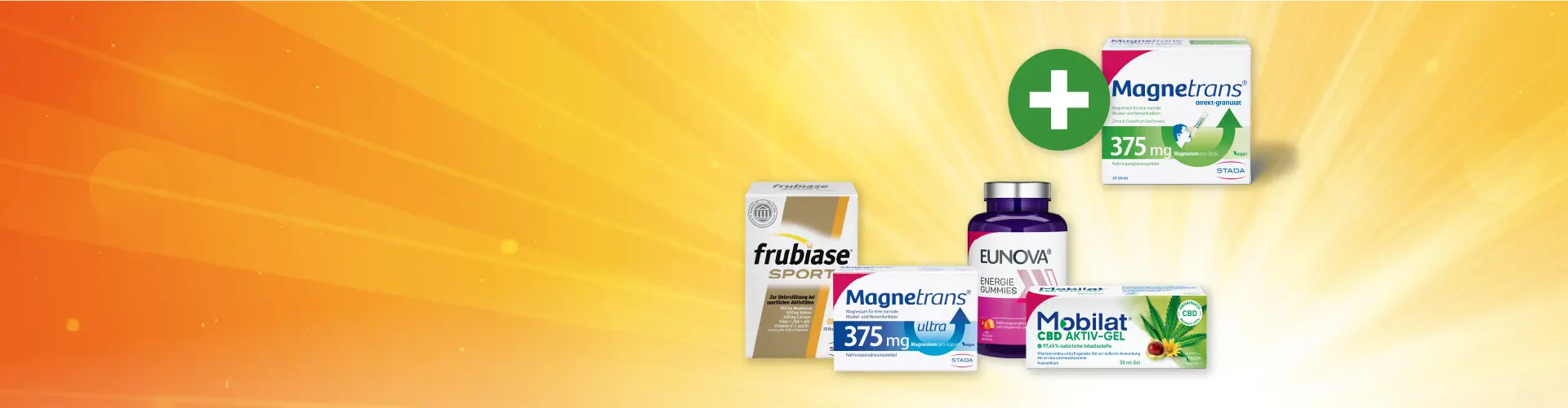 Kaufe 1x Produkt von frubiase® Sport, Magnetrans®*, EUNOVA® Gummies, oder Mobilat®* & erhalte gratis 1x Magnetrans® Direkt-Granulat** in Originalgröße