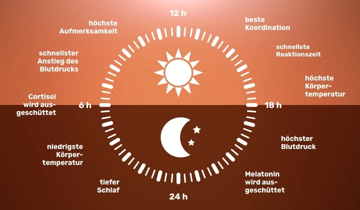 Morgens wachen wir dank Cortisol-Ausschüttung auf und werden fit für den Tag, sobald unser Blutdruck ansteigt. Wir erreichen am Vormittag unser höchstes Aufmerksamkeitslevel und haben am Nachmittag unser Hoch an Koordination und Reaktionszeit.2