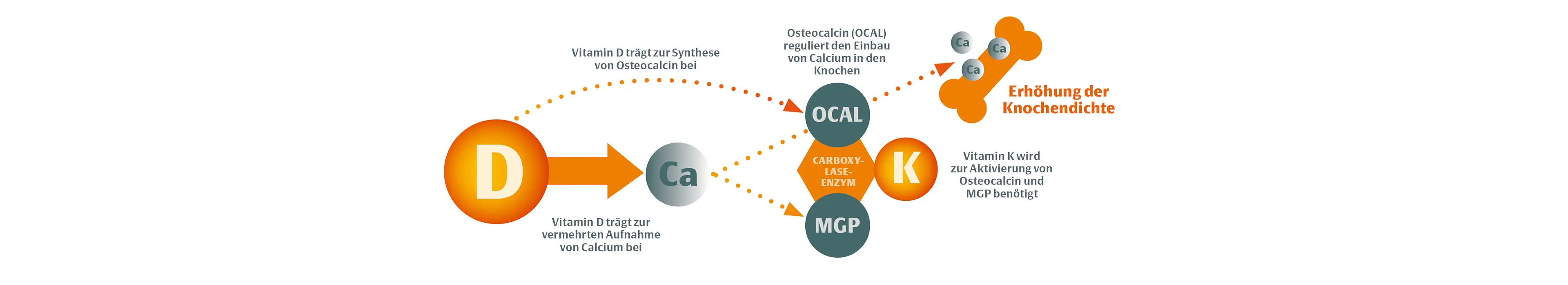 Osteocalcin kann jedoch nur Calcium in die Knochen einbauen, wenn es vorher aktiviert wurde. Dafür ist Vitamin K erforderlich. Ohne Vitamin K kann der Knochenaufbau nicht abgeschlossen werden.4 So tragen die beiden sich ergänzenden Vitamine D und K zum Erhalt normaler Knochen bei.