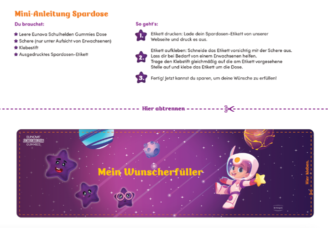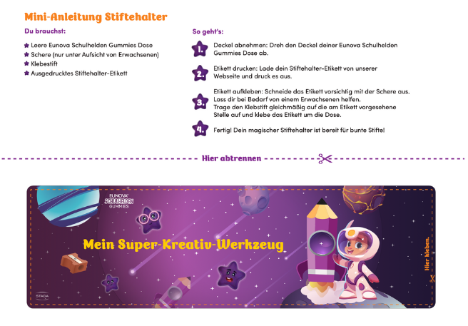 Hier im Downloadbereich finden Sie zwei tolle Vorlagen, um aus der leeren EUNOVA® Schulhelden Gummies Dose einen neuen, nützlichen Gegenstand zu machen. Ob eine starke Spardose oder eine kreative Stiftebox - mit der beinhalteten Anleitung ist das kreative Projekt einfach umzusetzen und die ganze Familie tut der Umwelt etwas Gutes!