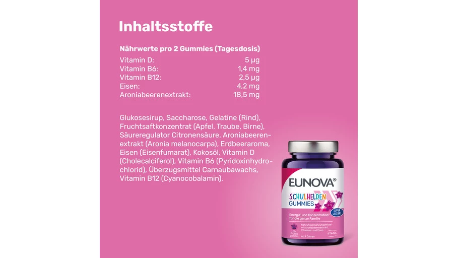 - EUNOVA® Schulhelden Gummies mit den Vitaminen B6, B12, D3 und Aroniabeeren-Extrakt