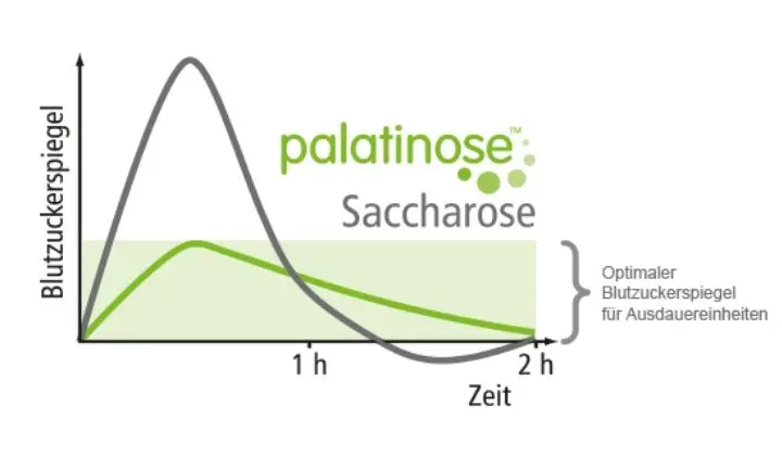 Die in Palatinose™ enthaltene Glukose geht langsamer ins Blut über. Daher bleibt der Blutzuckerspiegel stabiler (Insulinspitzen bleiben aus) und dem Körper steht die Energie aus dem Kohlenhydrat über einen längeren Zeitraum zur Verfügung. Vor allem bei einer sportlichen Betätigung von 1,5 bis 2 Stunden und mehr, bringt das innovative Kohlenhydrat somit besondere Vorteile.