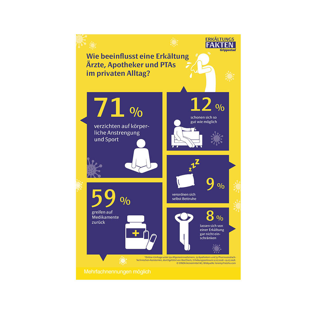 Haben Sie sich schon immer gefragt, wie eine Erkältung Ärzte und Apotheker in ihrem Privatleben beeinflusst? Unsere Umfrage zeigt: Der Großteil lässt sich die freie Zeit nicht von nervigen Erkältungssymptomen verderben – lediglich sportliche Aktivitäten sind für die Dauer der Erkältung für die meisten tabu.