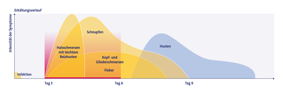 Bei einem grippalen Infekt treten im Verlauf die Beschwerden kurvenförmig auf: Sie beginnen schleichend, erreichen etwa am dritten Tag ihren Höhepunkt und nehmen dann langsam wieder ab.