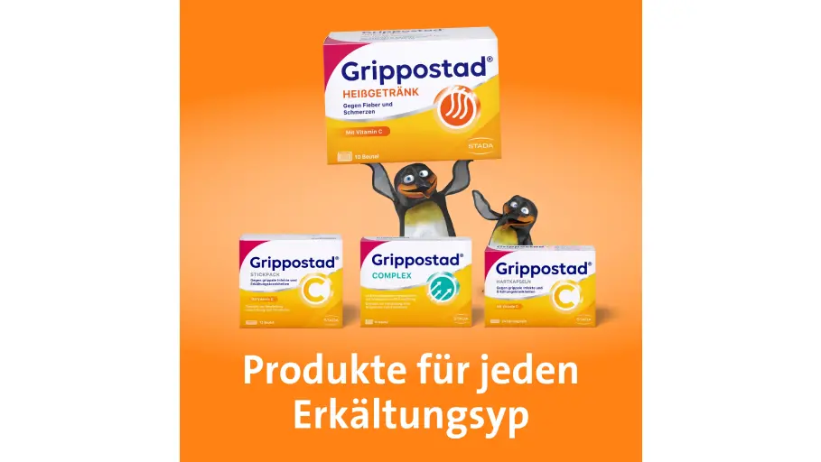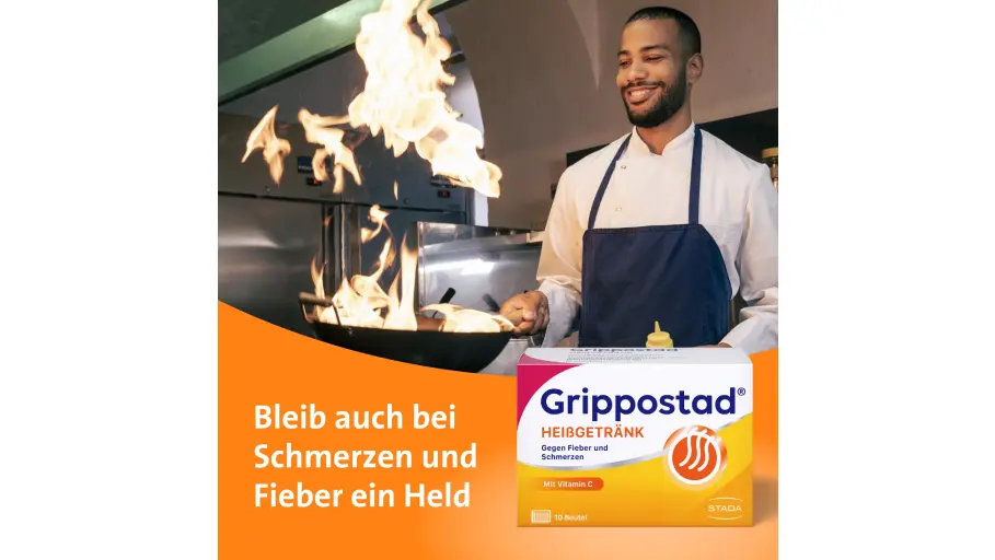 Kopf- und Gliederschmerzen sowie Fieber sind mitunter die häufigsten Beschwerden einer Erkältung, die meist zu Beginn auftreten. Grippostad® Heißgetränk wirkt dank Paracetamol effektiv bei Fieber und Schmerzen und unterstützt das Immunsystem mit Vitamin C. Als Heißgetränk schenkt es angenehme Wärme und führt wichtige Flüssigkeit zu.
