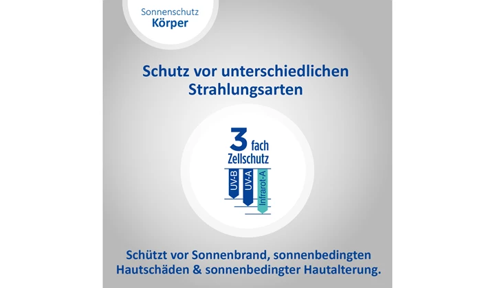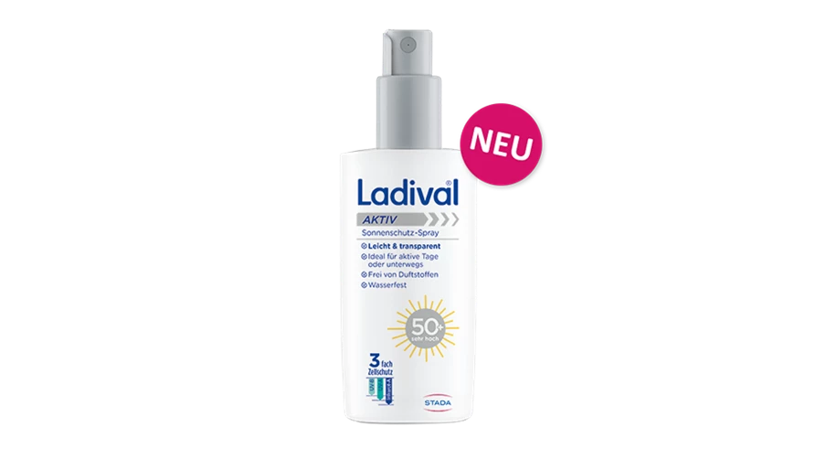 Sonnenstrahlen gibt es in verschiedenen Wellenlängen. Sie haben alle Auswirkungen auf die Haut und wirken langfristig zellschädigend. Daher ist es wichtig, täglich einen Sonnenschutz zu verwenden, der nicht nur vor Sonnenbrand und sonnenbedingter Hautalterung schützt sowie das Hautkrebsrisiko reduziert.1 Dank seines 3-fach-Zellschutzes schützt das Ladival® Aktiv Sonnenschutz-Spray vor UVA- & UVB-Strahlen. Zusätzlich schützt es auch vor den Folgen von Infrarot-A-Strahlung, um sonnenbedingter Hautalterung vorzubeugen.