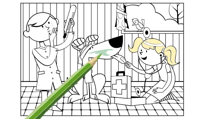 Bei Familie Lemolino wird es nie langweilig: Jeden Tag lassen die zwei Kinder sich etwas Neues einfallen. Gerade spielen sie, dass ihr Hund krank ist. Seine Ohren haben sie bereits mit einer Mullbinde verbunden, auf einem seiner Hinterbeine klebt ein Pflaster und er trägt einen Schal um seinen Hals. Ob er auch Halsschmerzen hat? Um das herauszufinden, untersucht Marie ihren Hund ganz genau. Um ihren Hals hat sie ein Stethoskop hängen, in der Hand hält sie einen Mundspatel. Auch ihr Bruder ist beschäftigt: Er blickt prüfend auf ein großes Fieberthermometer.