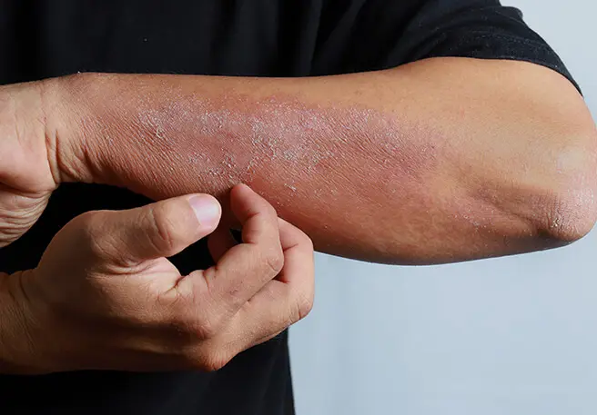 Für eine Hautentzündung sind gerötete Stellen, oft verbunden mit Schwellungen, Schuppen und Juckreiz die typischen Kennzeichen. So reagieren Sie auf eine Entzündung der Haut.