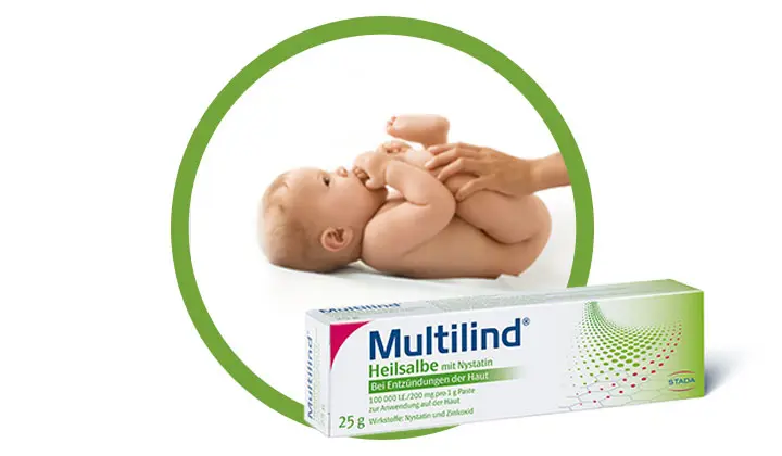 Feuchte Haut ist jedoch nicht nur empfindlicher, sondern begünstigt auch das Wachstum von Bakterien und Pilzen. Wichtig ist dann die richtige und schnelle Behandlung: Denn auf den roten Ausschlag kann häufig eine Pilzinfektion folgen. Heilsalben mit Nystatin aus der Apotheke wie Multilind® Heilsalbe können schnell helfen und die wunde entzündete Haut beruhigen.