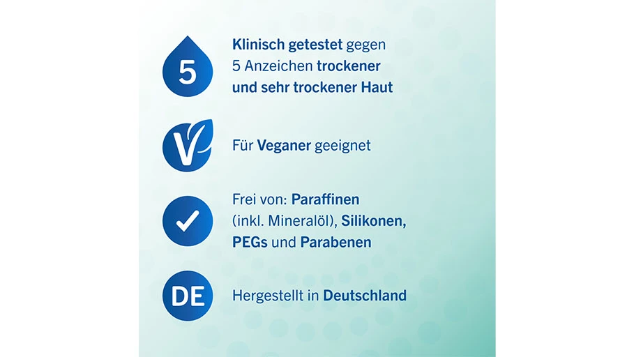 - Klinisch getestet gegen 5 Anzeichen trockener und sehr trockener Haut