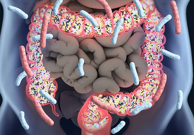 Bifidobakterien siedeln vornehmlich im Dickdarm. Hier übernehmen sie wichtige Verdauungsarbeit und tragen zur Darmgesundheit bei.