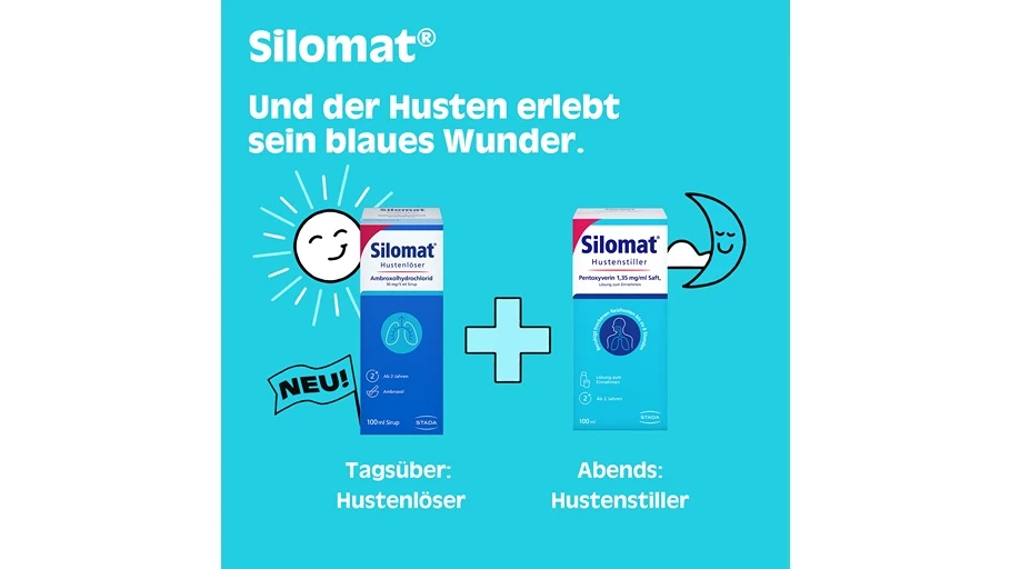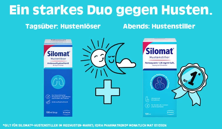 Für eine Verbesserung des Therapieerfolgs können Sie den Silomat®-Hustenlöser mit einem Hustenstiller kombinieren. Dafür nehmen Sie tagsüber den Ambroxol-Schleimlöser ein und greifen für die Nacht auf einen Hustenstiller mit dem Wirkstoff Dextromethorphan oder Pentoxyverin zurück. Dadurch wird die nächtliche Regeneration gefördert. Im Silomat®-Portfolio stehen verschiedene Hustenstiller zur Verfügung.