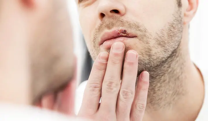 Bei Lippenherpes kommt es zu schmerzhaften Bläschen an der Lippe. Die Symptome treten typischerweise in mehreren Phasen auf: