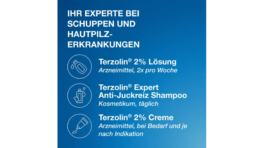 - Terzolin® ermöglicht eine medizinische und effektive Behandlung von Schuppen, dem Verwender seit Jahrzehnten vertrauen.