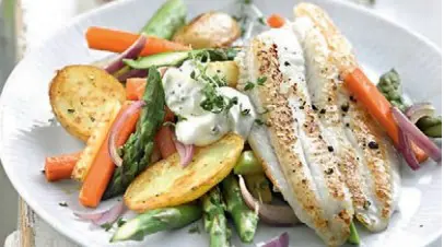 - Fischfilets mit Pfannengemüse, Dip und Kresse anrichten.