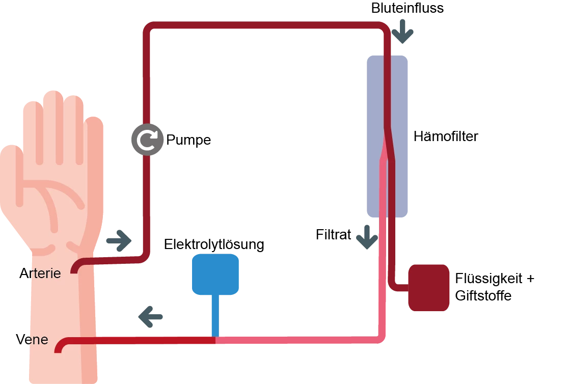 Die Hämofiltration basiert auf dem Prinzip der Ultrafiltration. Über eine Filtermembran werden dem Körper größere Mengen Flüssigkeit mitsamt der Giftstoffe entzogen. Dies geschieht wie bei der Hämodialyse außerhalb des Körpers. Der große Unterschied besteht jedoch darin, dass es bei der Hämofiltration kein Dialysat gibt. Die entzogene Flüssigkeit wird dem Körper über eine Elektrolytlösung wieder zugeführt. Die Hämofiltration erfolgt kontinuierlich über mindestens 24 Stunden, somit ist der Zeitaufwand höher als bei der Hämodialyse.