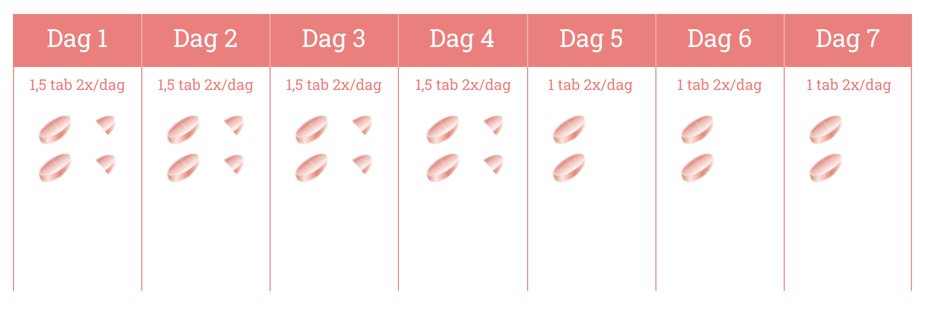 Tijdens de eerste 4 dagen van de behandeling is de dagdosis 3 tabletten (toegediend als 1½ tablet tweemaal daags). Tijdens de volgende 3 dagen is de aanbevolen dagelijkse dosis 2 tabletten (toegediend als 1 tablet tweemaal daags). De tabletten moeten met maaltijden ingenomen worden.