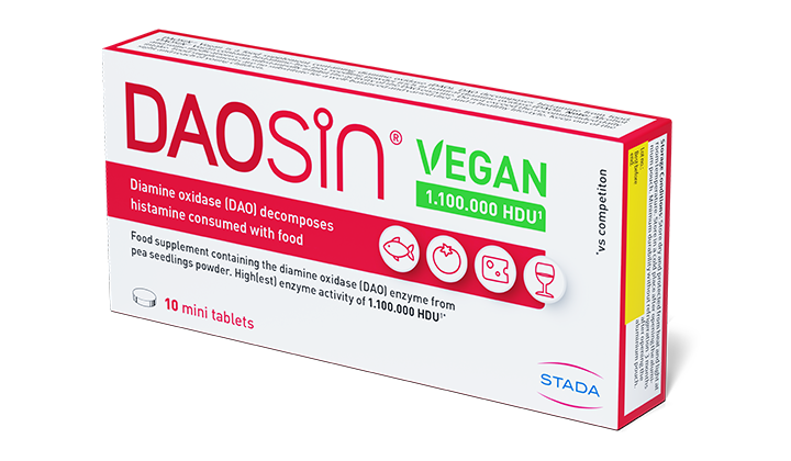 DAOSiN® Vegan is a food supplement containing the diamine oxidase (DAO) enzyme from pea seedlings. Diamine oxidase (DAO) decomposes histamine consumed with food.