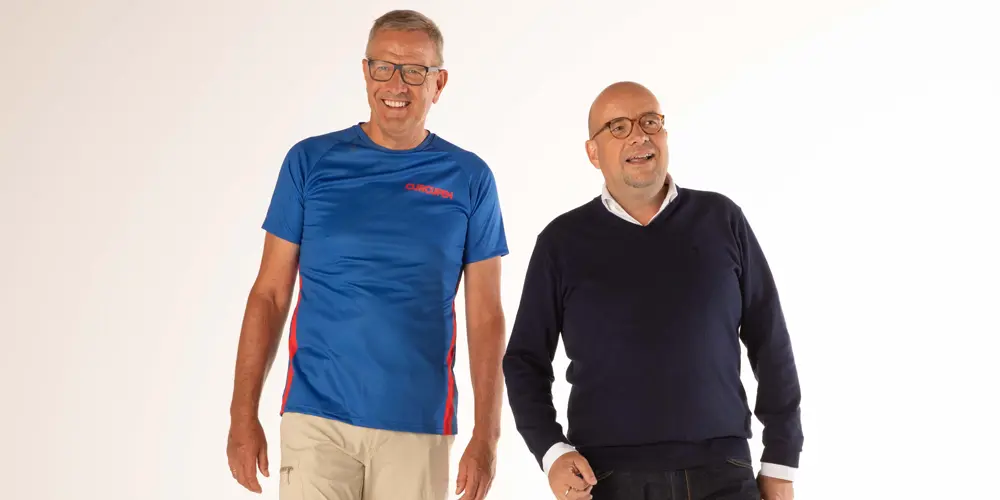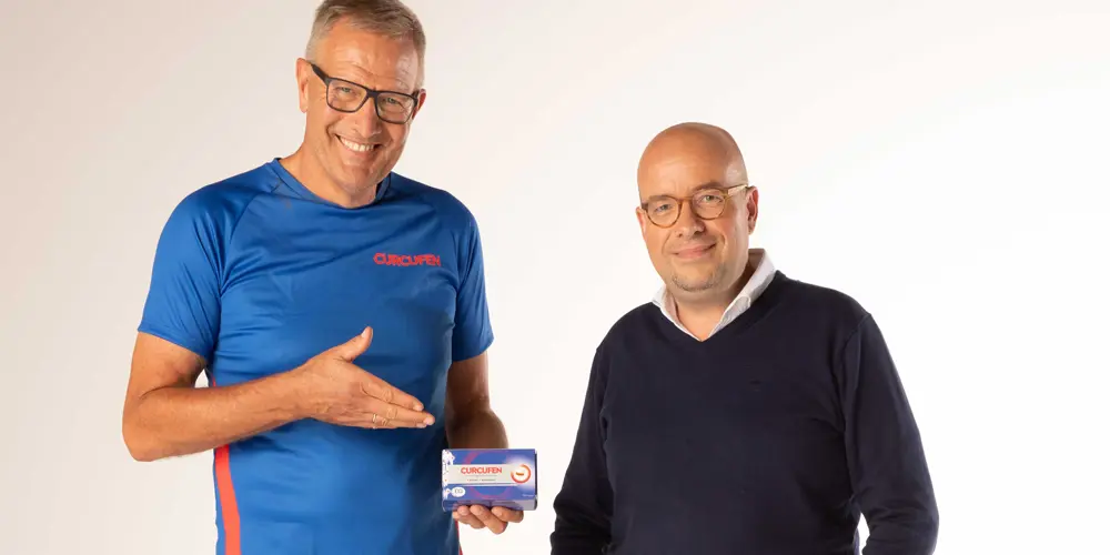 Sven en Jef hebben nog iets gemeen: ze nemen allebei dagelijks Curcufen Forte (een voedingssupplement dat je helpt om vlot te blijven bewegen dat een unieke combinatie van 2 krachtige extracten bevat: Curcuma longa en Boswellia serrata.) Sven is ambassadeur voor het merk en Jef gelooft rotsvast in de kwaliteiten van een van de topproducten van het bedrijf dat hij leidt. Jef slaat nooit een dag over. Sven durft af en toe wel eens stoppen als het doosje leeg is. Maar geen zorgen hé Jef. Ik ben écht een goeie ambassadeur. Ik voel het direct aan mijn lichaam als ik even geen Curcufen Forte neem. Dan komt dat zeurderige gevoel bijna onmiddellijk terug. Gelukkig is dat na enkele capsules ook weer even snel weg. Heel wat mensen rondom mij zijn nu ook trouwe gebruiker geworden en zeggen allemaal hetzelfde. Je voelt het verschil. Dat klopt reageert Jef enthousiast. Curcufen Forte wordt heel snel opgenomen door je lichaam omdat we het in vloeibare vorm aanbieden. Ik sla écht geen enkele dag over, maar ja Sven, ik kan natuurlijk niks anders zeggen. Beide heren schieten onbedaarlijk in de lach.