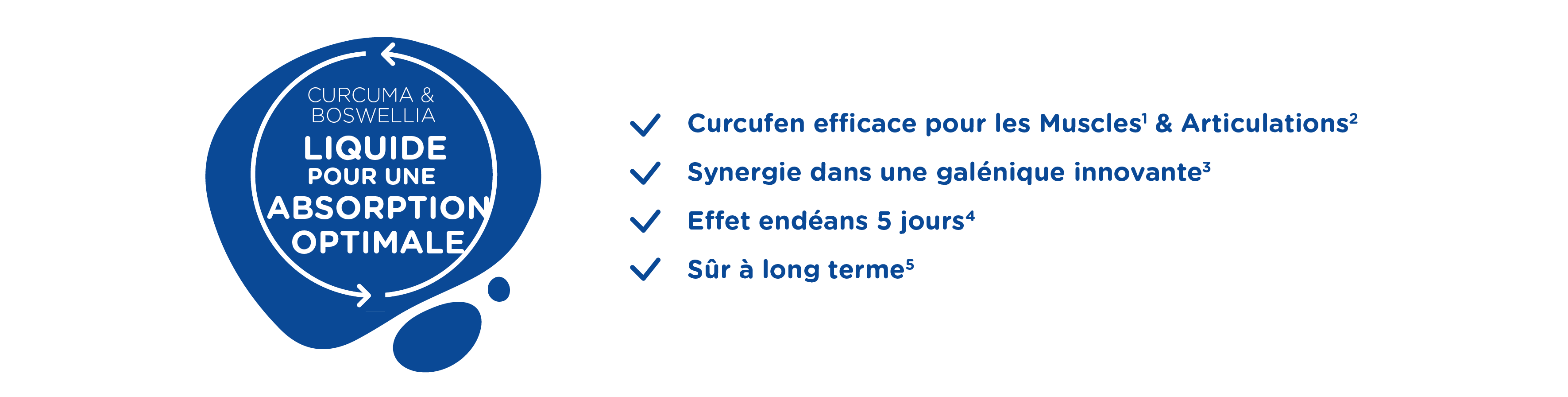 1) CURCUFEN® contient de la vitamine D3, qui contribue au maintien du bon fonctionnement musculaire. 2) Curcuma longa et Boswellia serrata pour des articulations souples. 3) Synergetic Effect of NovaSOL® Curcumin /Boswellia. Frutarom Belgium 4) Vishal et al. (2011) International Journal of Medical Sciences 8(7): 615-622. 5) Notice CURCUFEN®