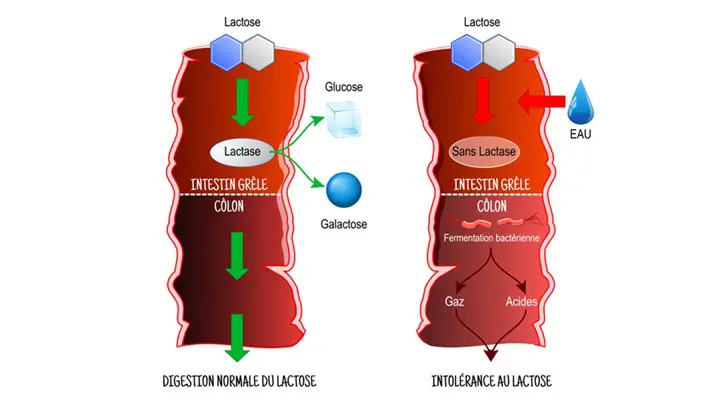 L’organisme ne peut métaboliser le lactose qu’au moyen de sa propre enzyme digestive, la lactase, qui transforme le lactose dans l’intestin grêle en nutriments glucose et galactose. Les personnes souffrant d’une intolérance au lactose n’ont pas (ou pas assez) d’enzyme lactase. Si la lactase est absente ou en quantités insuffisantes, le lactose n’est pas suffisamment dégradé et ne peut pas être absorbé par l’intestin grêle.